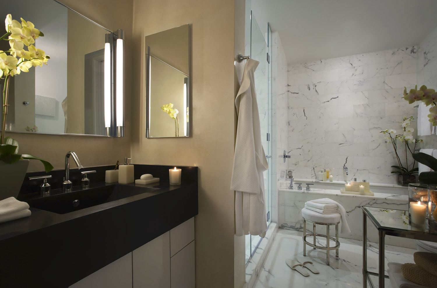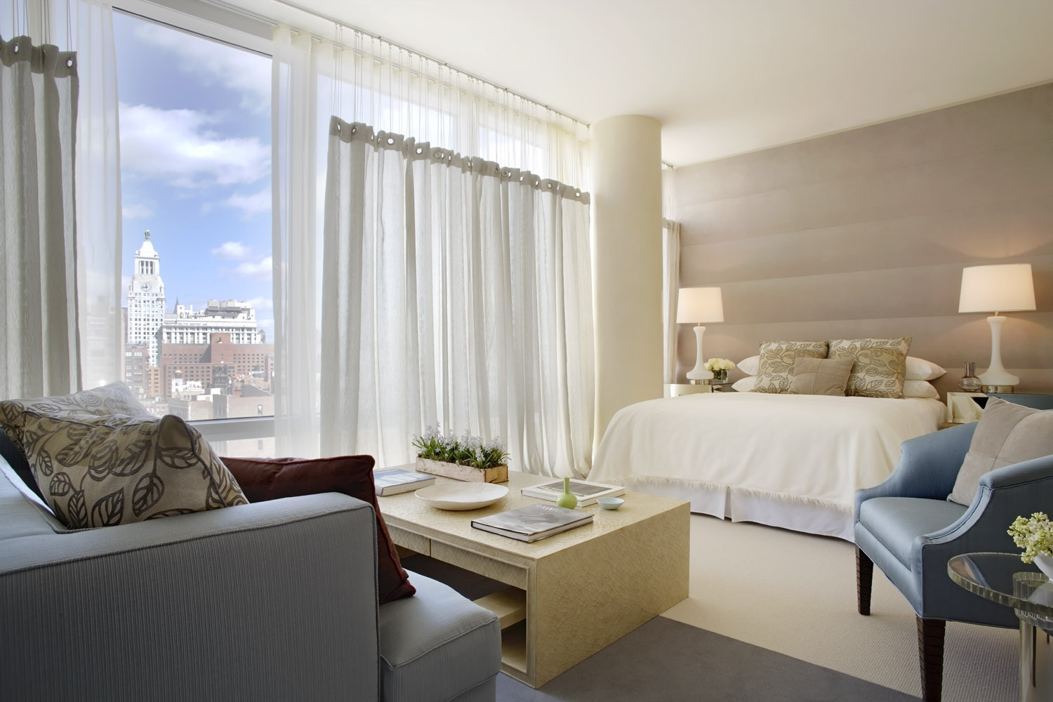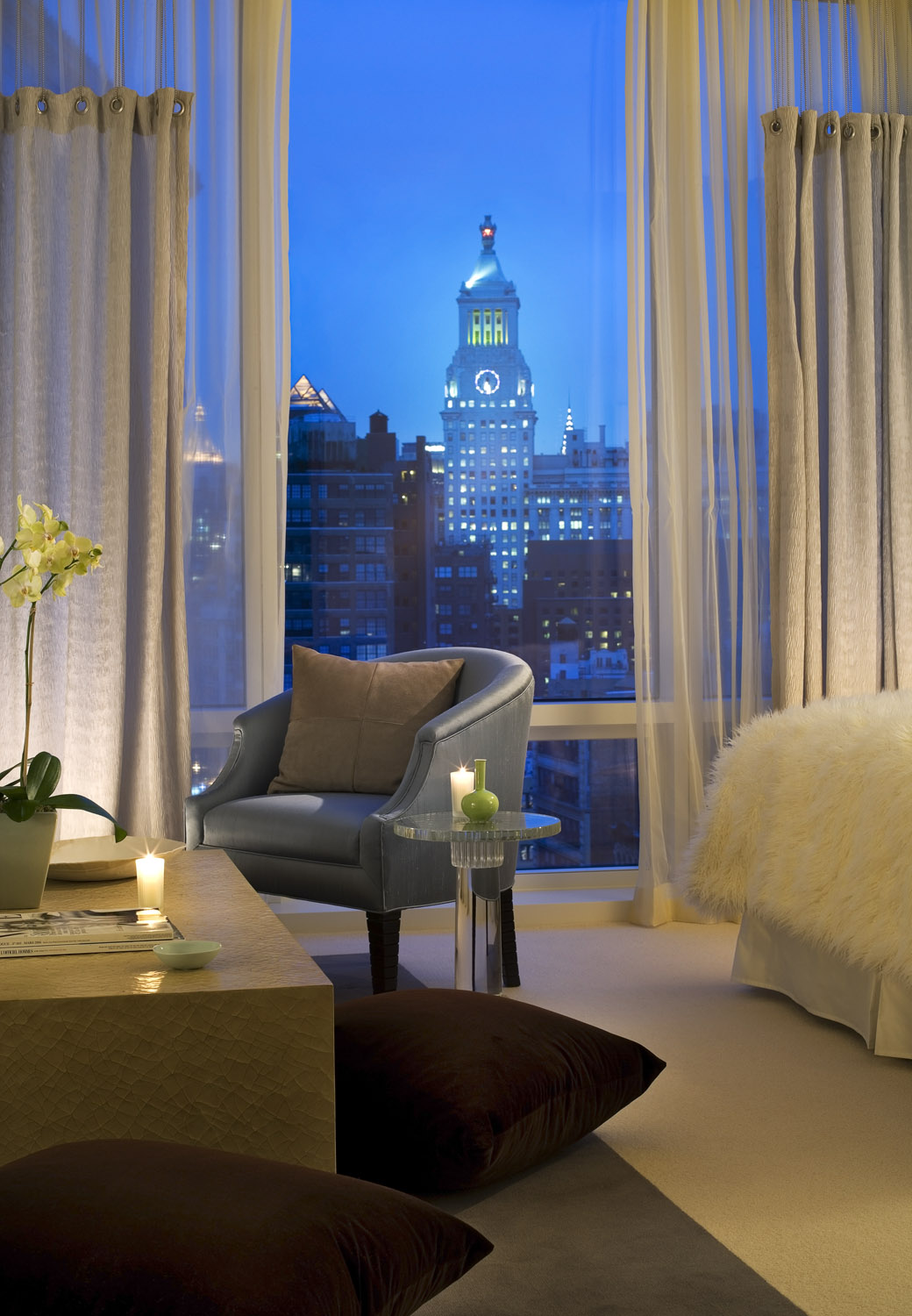 Channeling the curvatious floor to ceiling glass skyscraper this apartment embodies the downtown NY modern loft life. The soft forms and accentuation of warm inviting materials takes the edge off the stark structure. The open plan living-dining “great” room provides for many distinct views of the Soho’s landscape.
