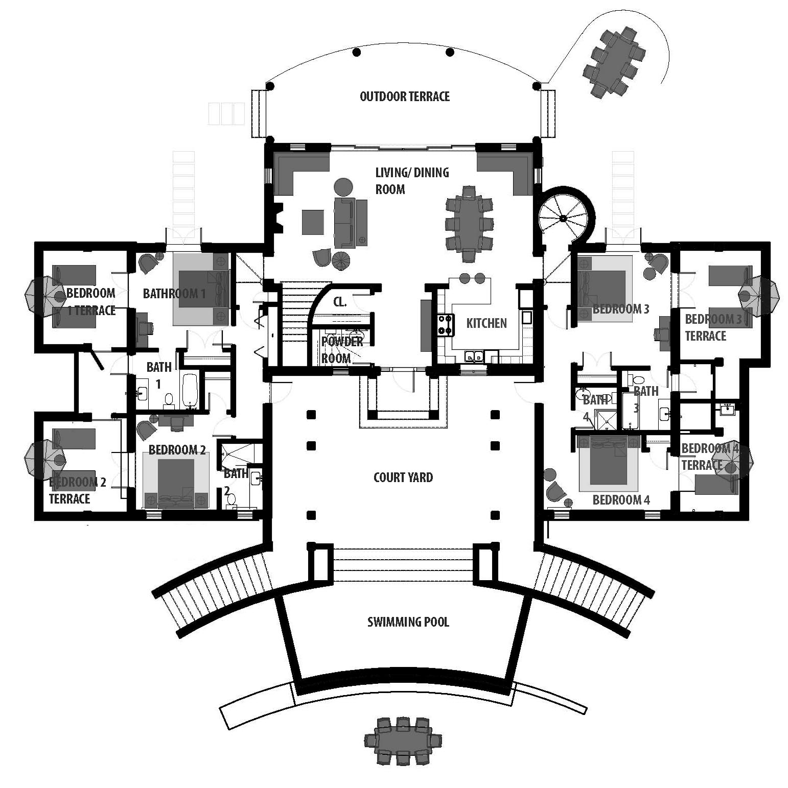 This six bedroom house is in development on a private club island, Ambergris Cay in the Turks and Caicos Islands. Utilizing caribbean architectural themes while promoting use of the gently sloping terrain, the house sits proudly atop the sweeping dune bluff. A protected courtyard opens onto an infinity pool fountain.