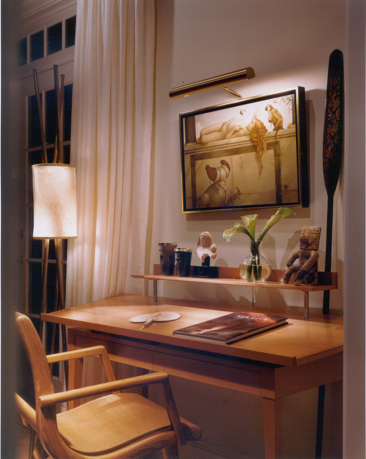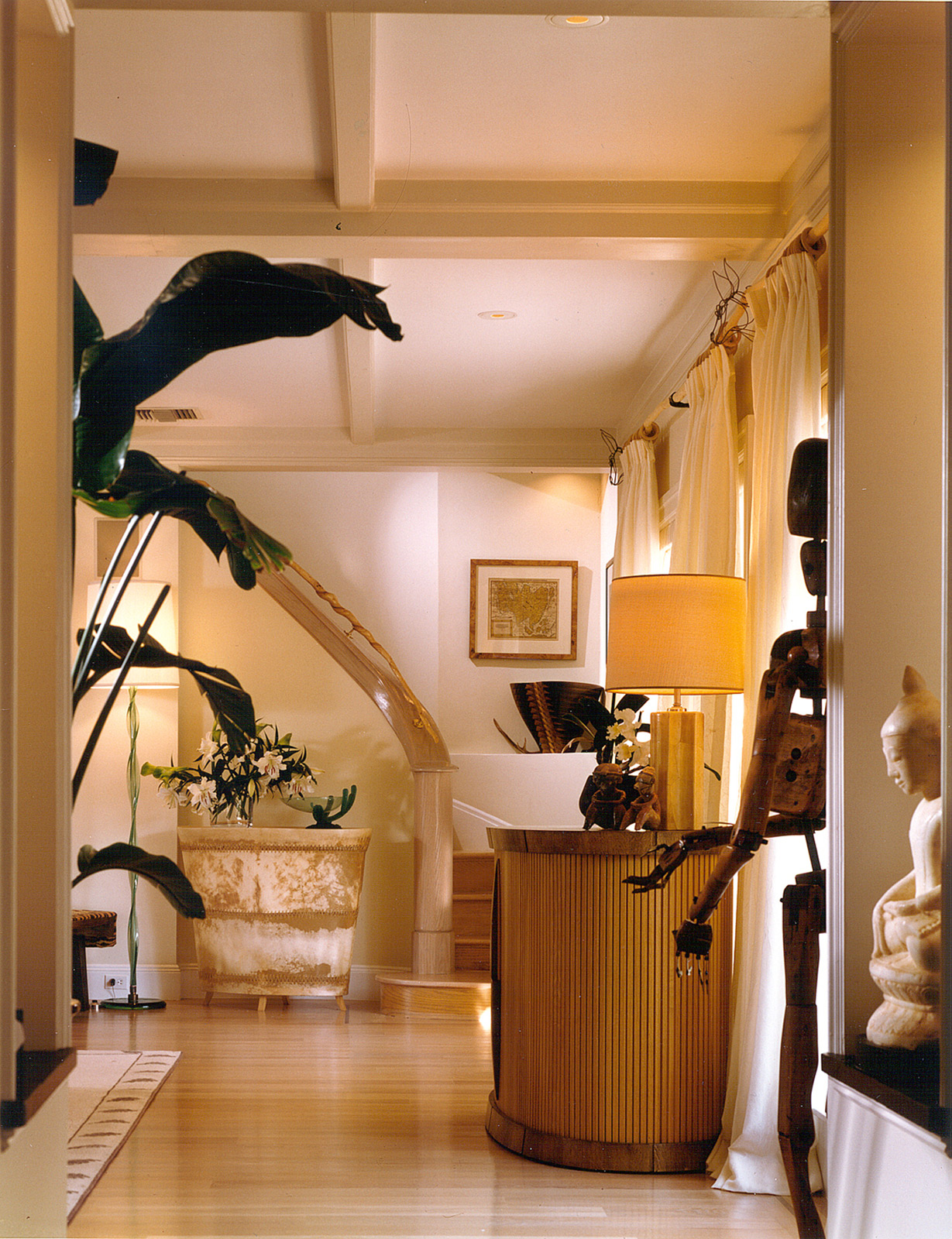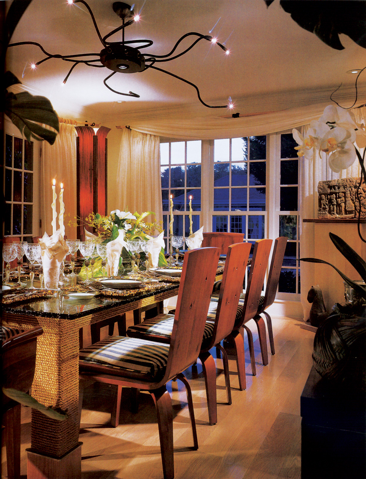 We combined a full renovation and expansion for this 1940s clinker brick style house in the estate section of Southampton. The client requested a sophisticated summer retreat to display an eclectic art collection while providing a relaxed entertaining atmosphere. The theme evolved to a country lodge featuring a whimsical play on traditional lodge elements including antler curtain rods, rope finials and distinct Asian restraint to compliment the client’s own life and style. A glass roofed terrace connects all the entertaining rooms for a year-round indoor-outdoor entertaining experience.