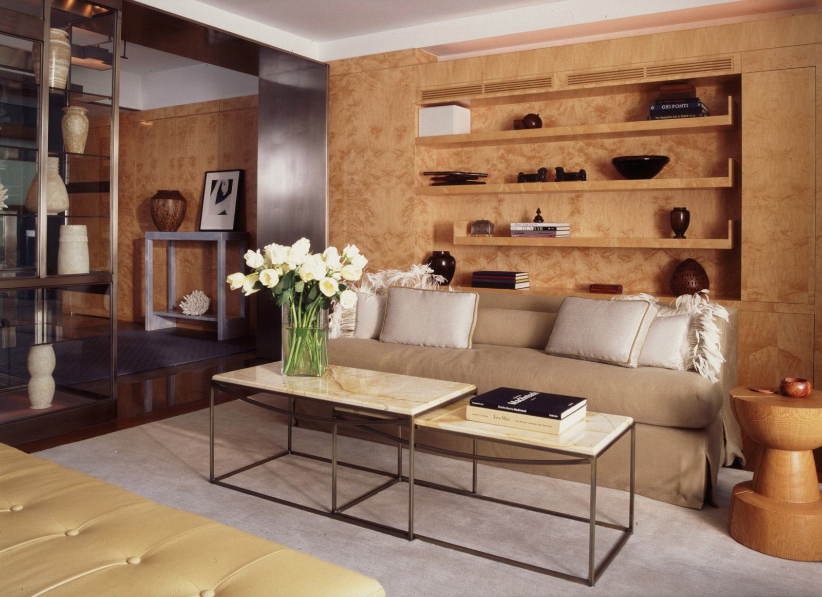 These often traveling clients involved with glassworks and jewelry wanted a distinctly park view “New York” look. Organizing the entertaining rooms around a central entry “court” we connected the spaces with a continuous meandering wall of light figured wood and “walls of light.” The entry threshold gunmetal and glass vitrine houses the client’s furniture miniatures and all furniture was created and customized to the interiors.