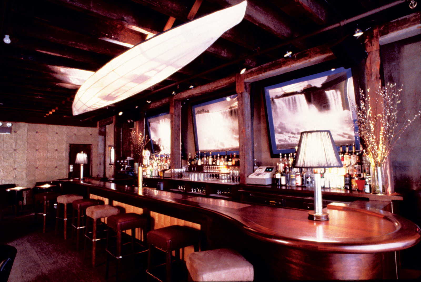 A relaxed adironach theme bar in the center of SoHo. An updated use of the traditional details creates a very local and timeless atmosphere, for instance, the antler screen and canvas canoe fixture harken to a craft era and enhance the relaxed laid back sensibility.