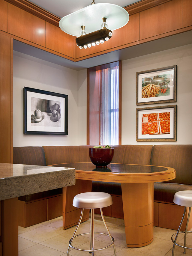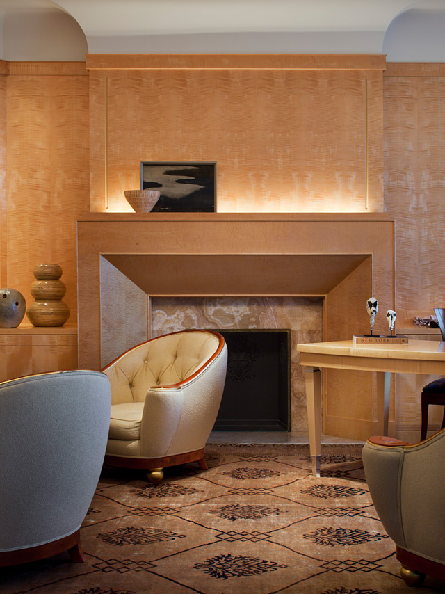 A 4500sf apartment with commanding Central Park views. A soothing “French” salon feeling was created using blonde sycamore wood, light ash floors and fabric panels that offset the late deco period furniture. The kitchen was realized in natural pear wood and many custom fixtures were created.