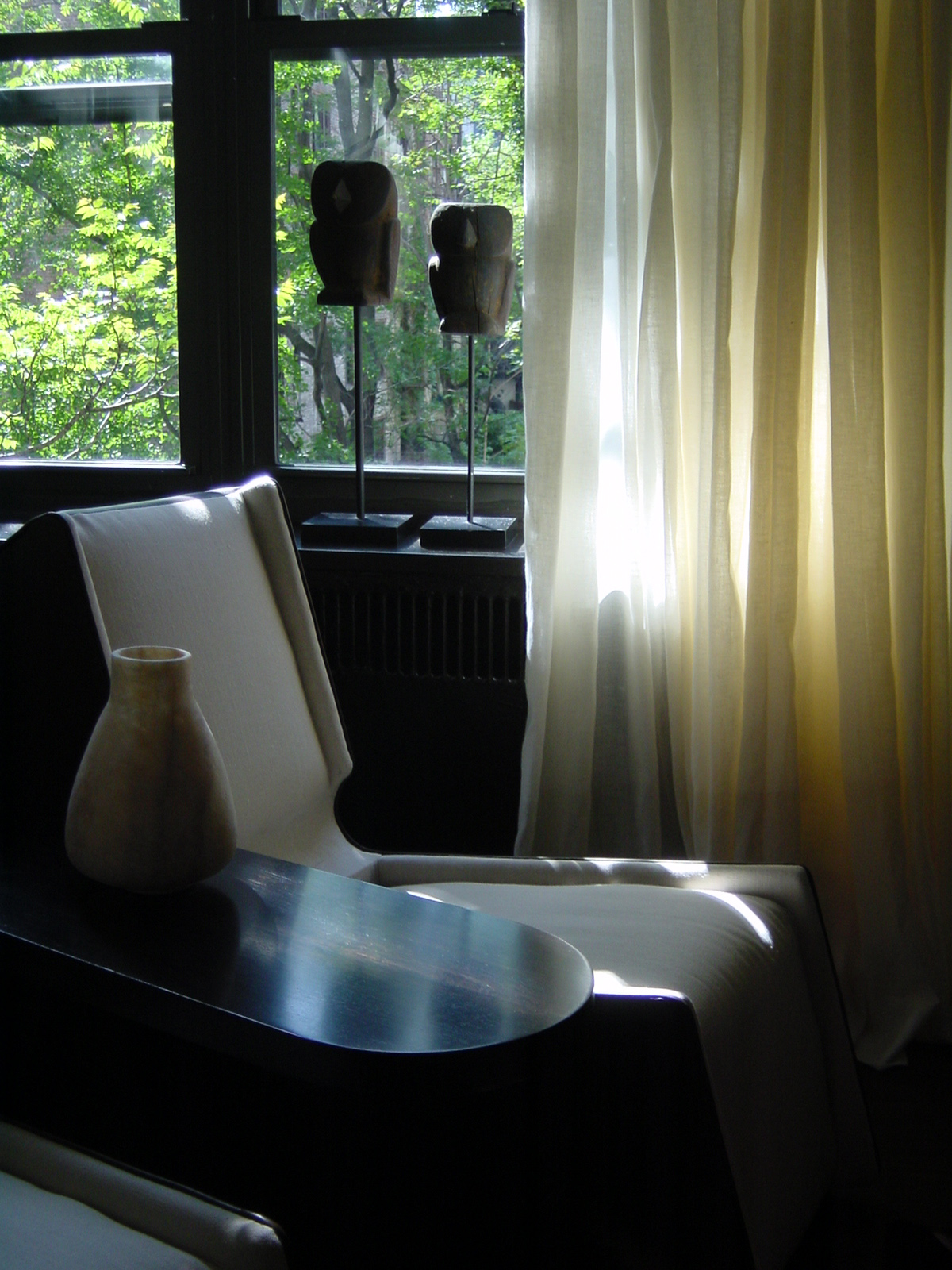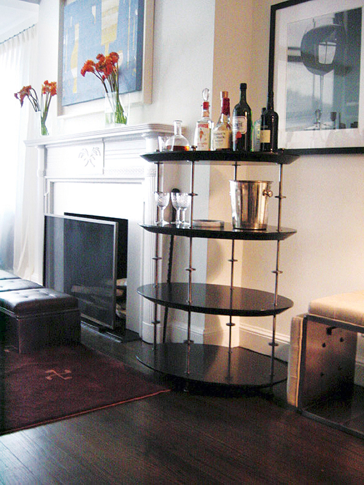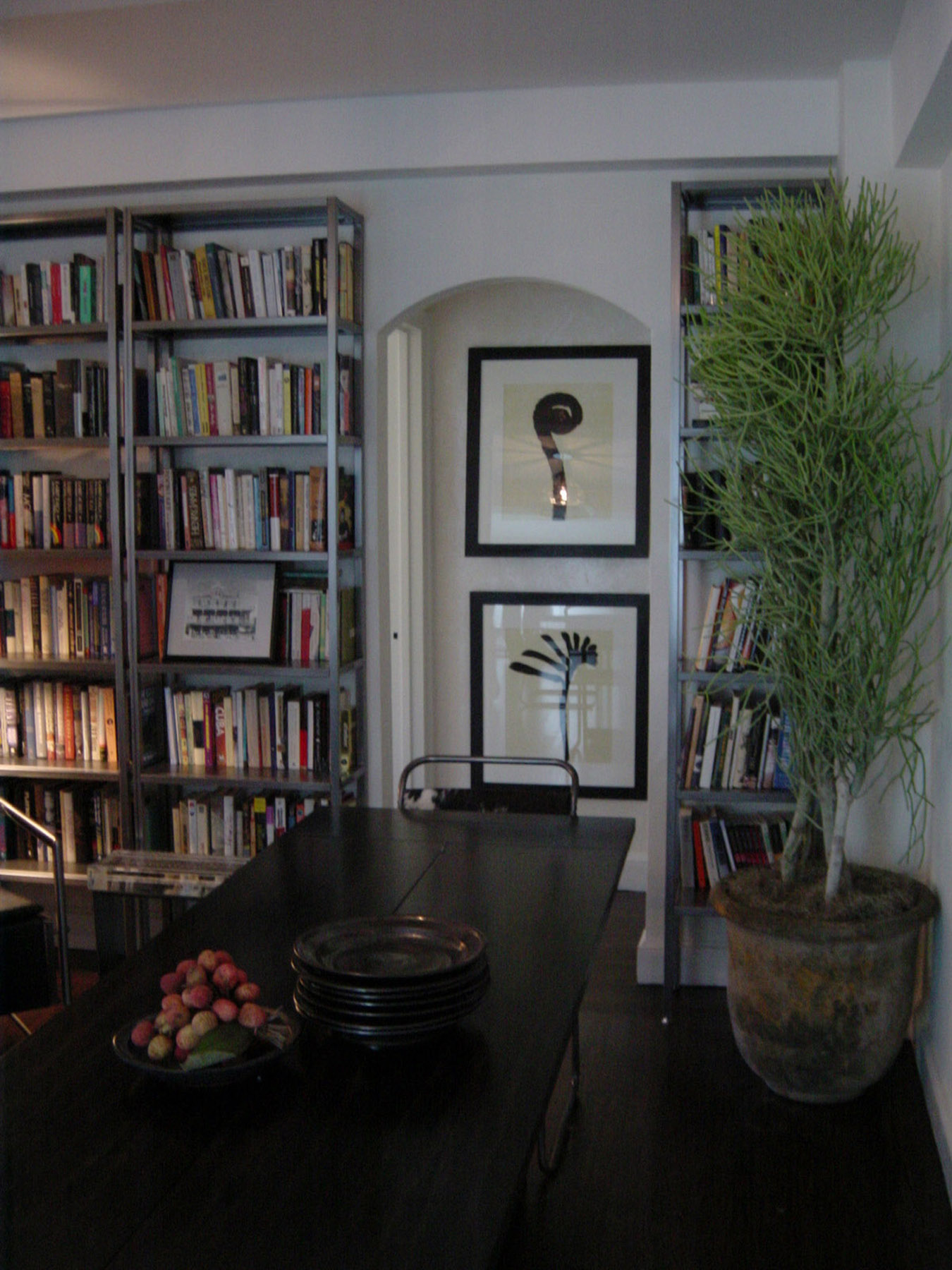 This apartment was designed around the new CAMPION “Campaign Furniture” line. We transformed a writer’ss Pied-a-Terre into a richly appointed bachelor’s entertaining apartment. Owing to the owner’s large book collection, we divided rooms with airy bookshelves in dark ebony and steel fittings. The overall theme is masculine, but the decor and spirit is decidely relaxed and informal.