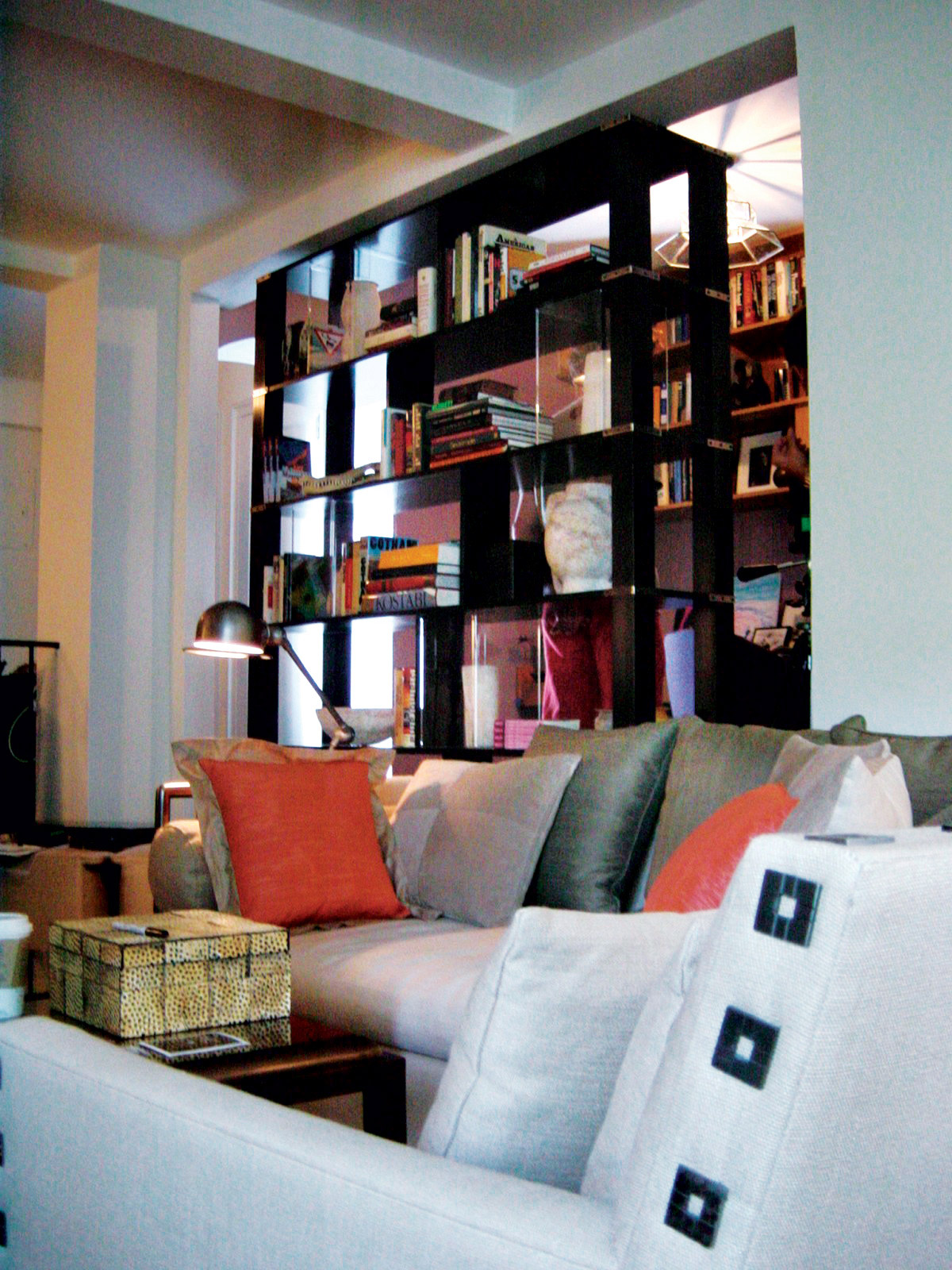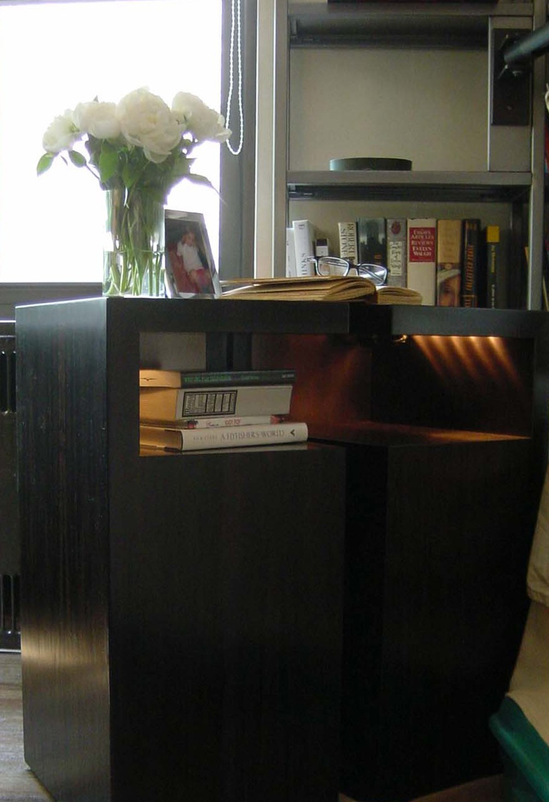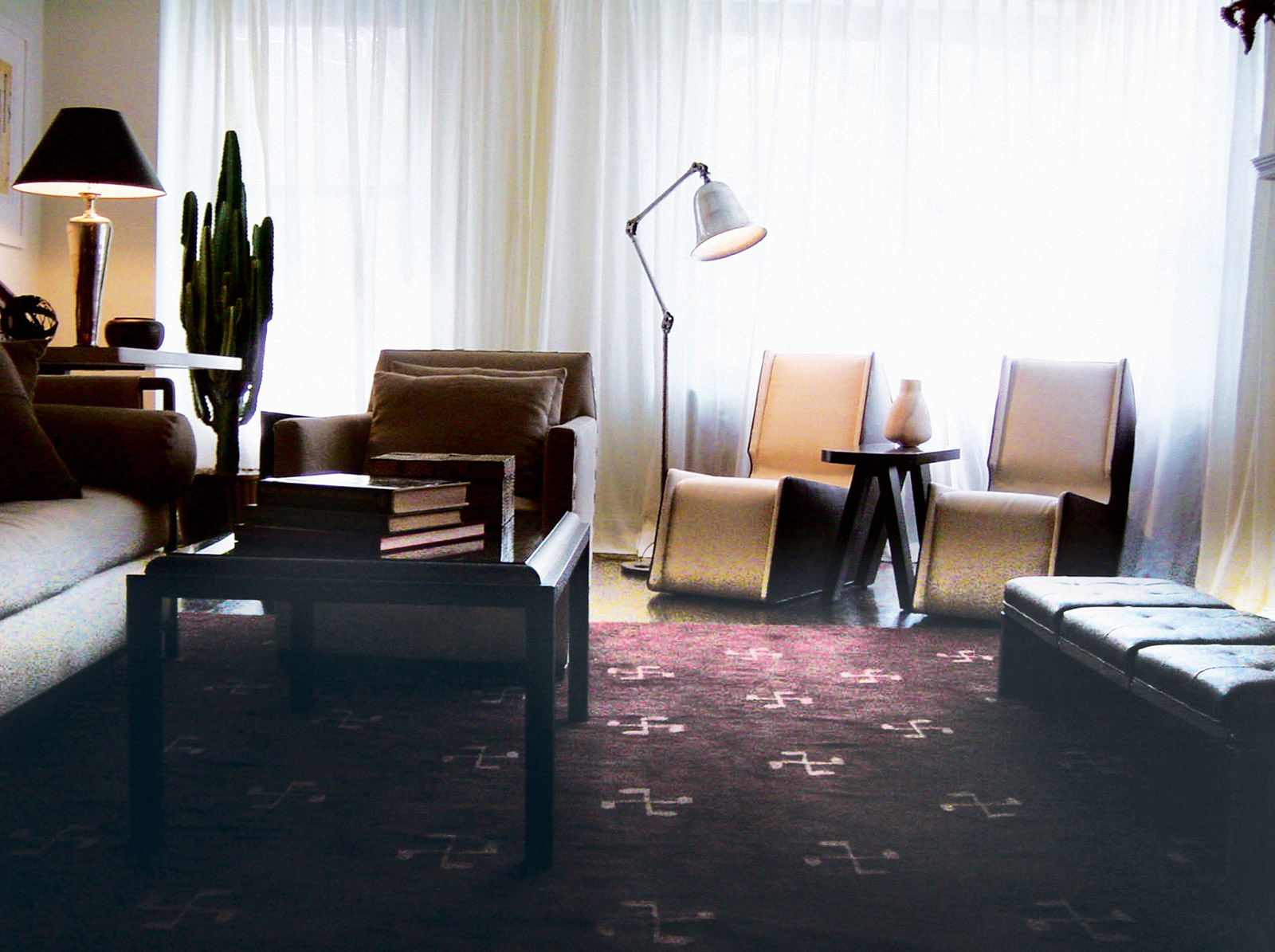 This apartment was designed around the new CAMPION “Campaign Furniture” line. We transformed a writer’ss Pied-a-Terre into a richly appointed bachelor’s entertaining apartment. Owing to the owner’s large book collection, we divided rooms with airy bookshelves in dark ebony and steel fittings. The overall theme is masculine, but the decor and spirit is decidely relaxed and informal.